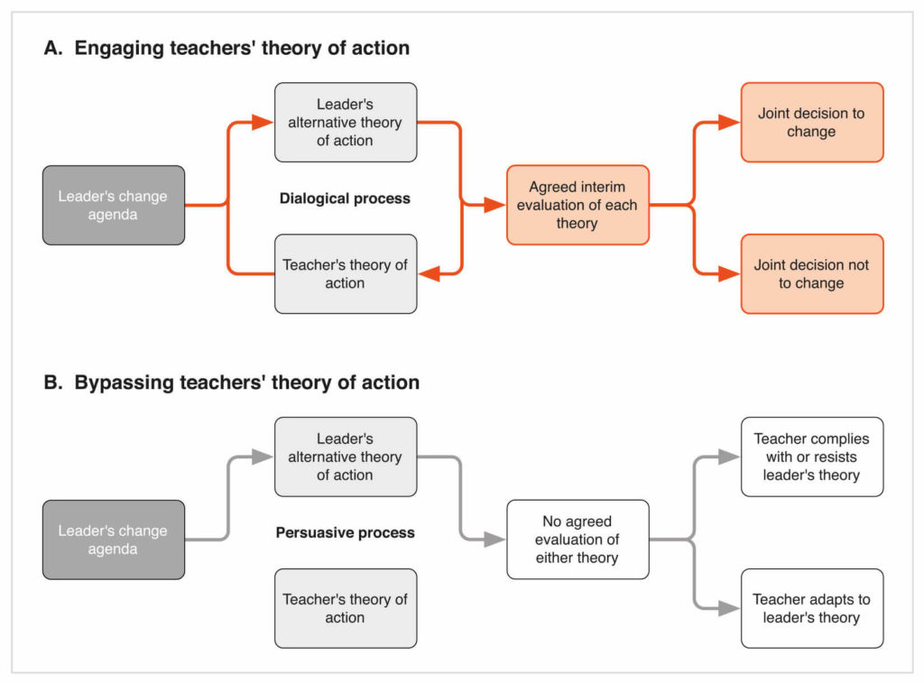 It considers two approaches to broaching change, one a dialogical approach, where the leader works through the theories of action with their staff, and the other where they take a persuasive approach to embedding their own theory of action.